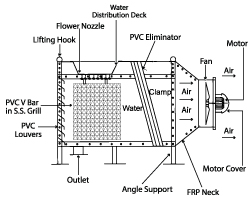 The cross flow tower is one of the best maintenance free designs in cooling tower, which offers good efficiency, easy maintenance and very low blockage for the tower. They operate on the induced draught cross flow principle. Air passes through one side of the tower to the other side of the tower through the fan on the side.
